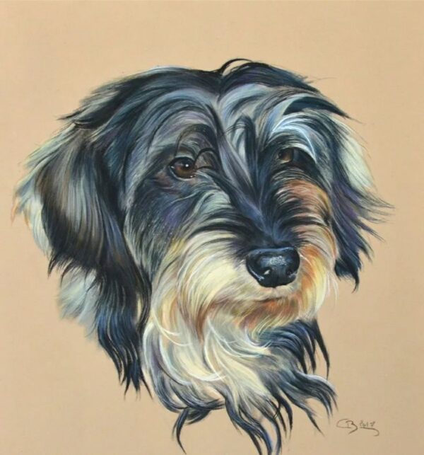 Dans ce portrait de chien  vibrant en pastel, l’artiste capture avec tendresse et précision la personnalité du fidèle compagnon.